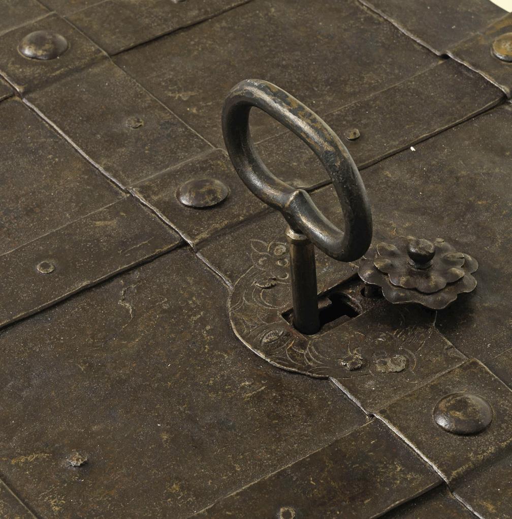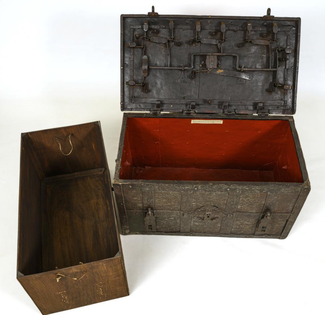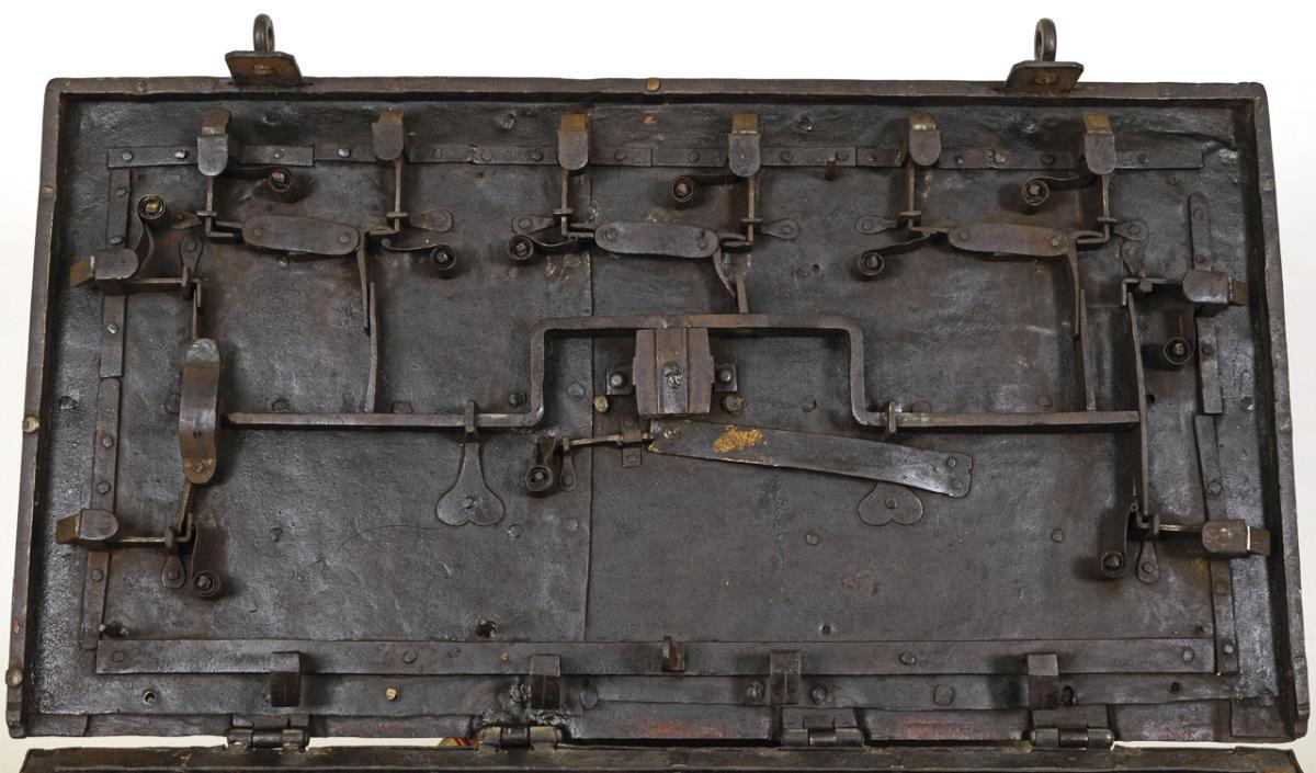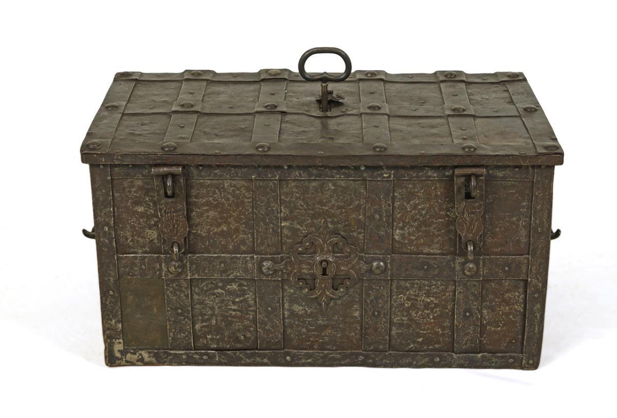Very heavy iron chest with riveted bands on all sides and on the lid. Front side with 2 hasps and 1 mock keyhole with decoration. Hinged carrying handles on the sides. Hinged lid with hidden keyhole under original lockable cover rosette. Interior open lock mechanism with 10 firing latches and 4 fixed tumblers. Younger plywood insert removable. Some weld marks, minor additions, egg straightener with supplemented straightening washer, key reworked, at least the reid supplemented.
