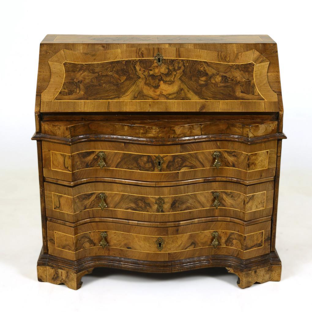 Sloping flap secretary with curved 3-bay chest of drawers lower part and secretary upper part with obliquely applied writing flap, decorated with coffered burl veneer and ribbon inlays, movable claw handles; writing compartment inside with open compartment and 3 small drawers. Traces of age/use, restored.