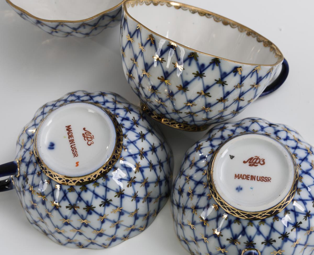 Cobalt blue net pattern and gold staffage.