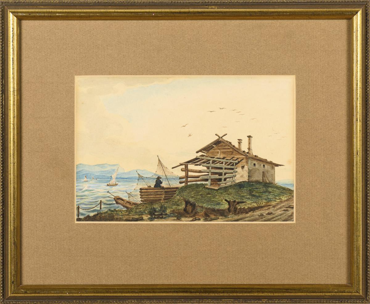 The fisherman repairing the net at the hut with a view across the water to the sailors.