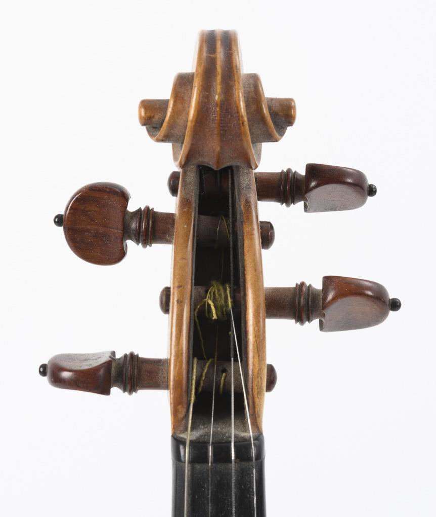Locked maple, split spruce top, ebonized wood. Bow probably brazilwood. Body 35,5 cm. Bow 69,5 cm.