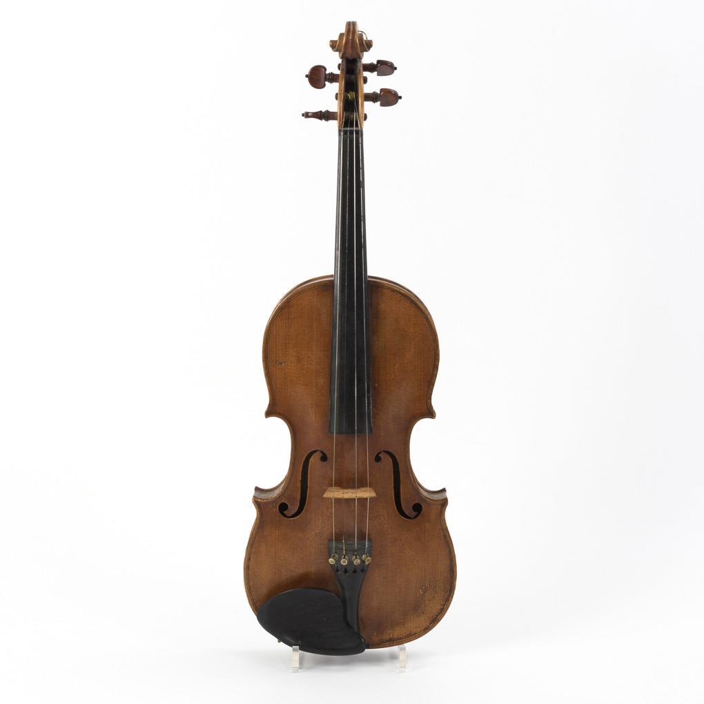 Violin with chin rest. Bow with round stick. Comes with some strings and handwritten vocabulary booklet with performance styles. Brown case. Pressure mark on the top, edges somewhat bumped, slight damage to the varnish. Sheet in need of restoration. Case partly defective.