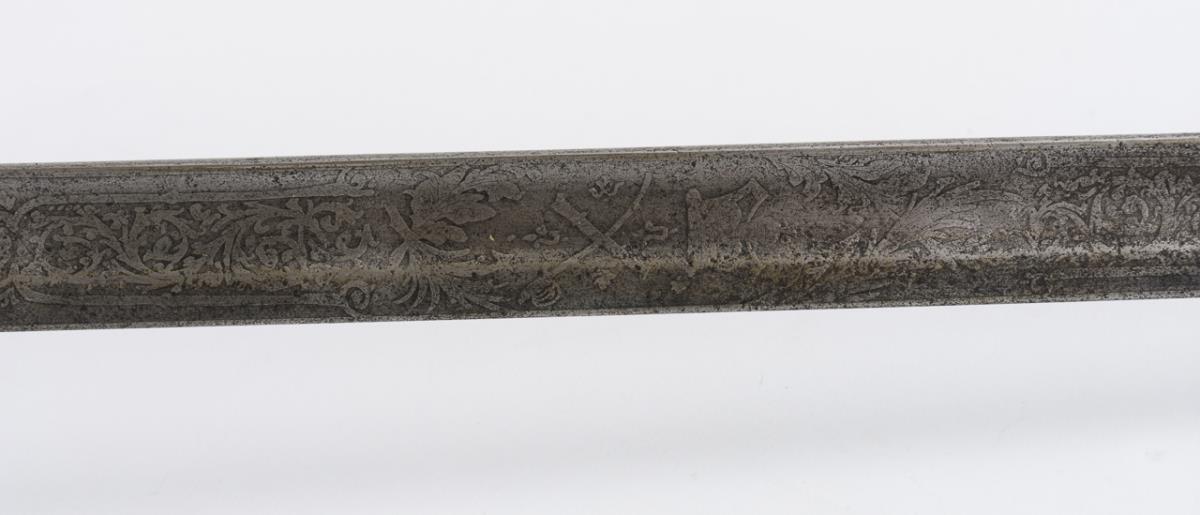 Straight, single-edged blade with etched pattern on both sides. Handle wrapped with checkering. Three-pronged brass hilt with crowned emblem. Marks of age.