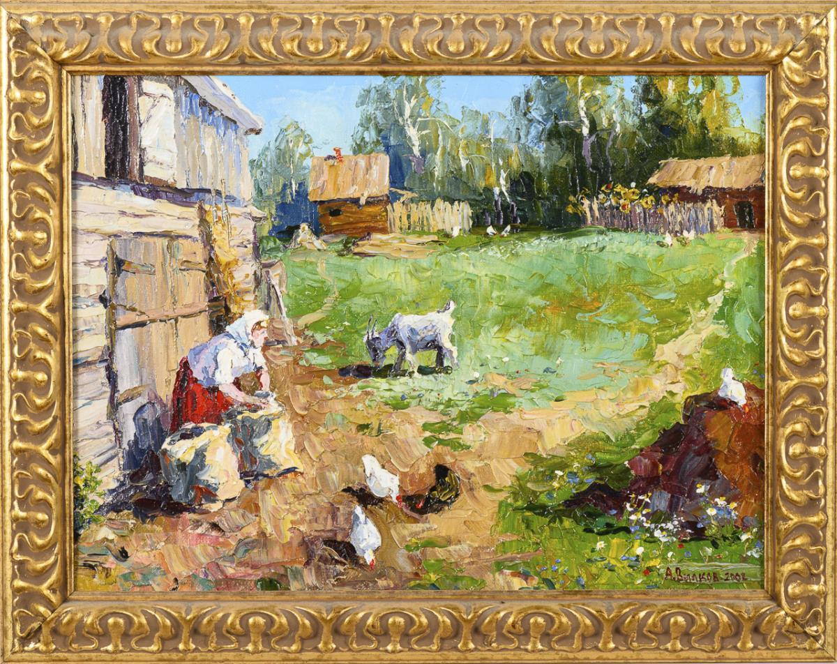 Russian painter: peasant woman with goat and poultry