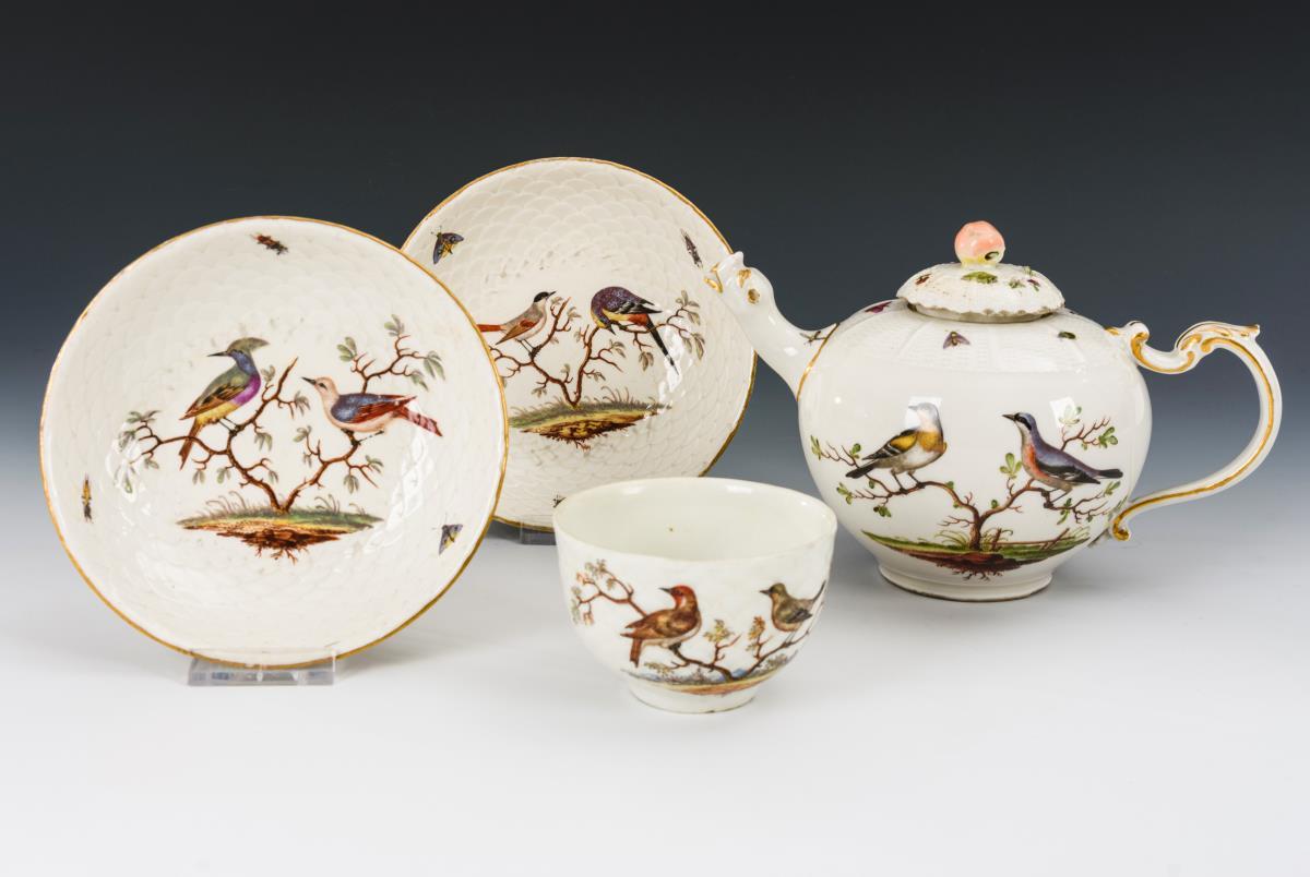 Deckel des Birnkännchens ergänzte, partieller Goldabrieb, Teekännchendeckel bestoßen, 2 minimale Bestoßungen an 1 Untertassenrand.