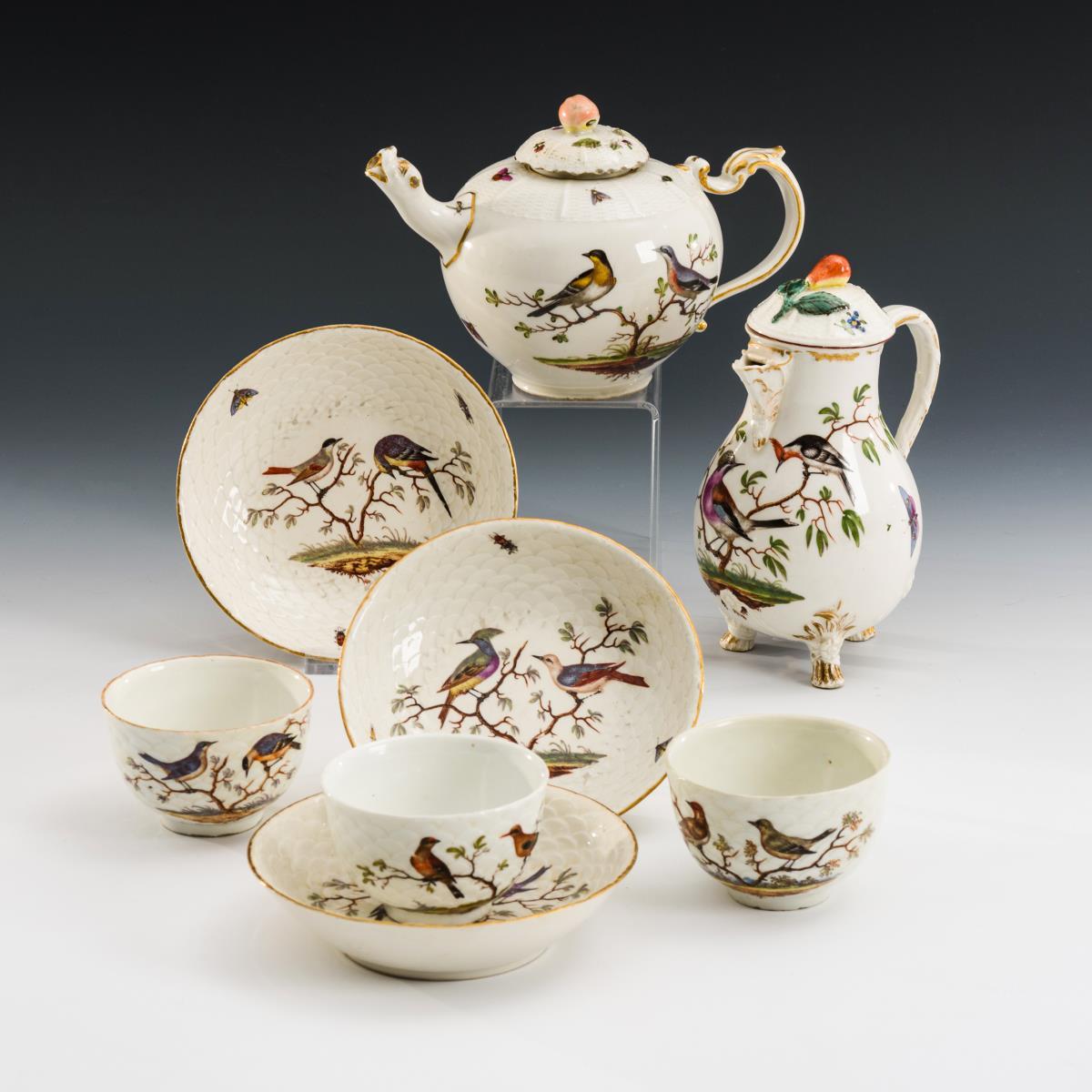 2 Kännchen, 3 Tassen und 3 Untertassen mit Vogelmalerei.