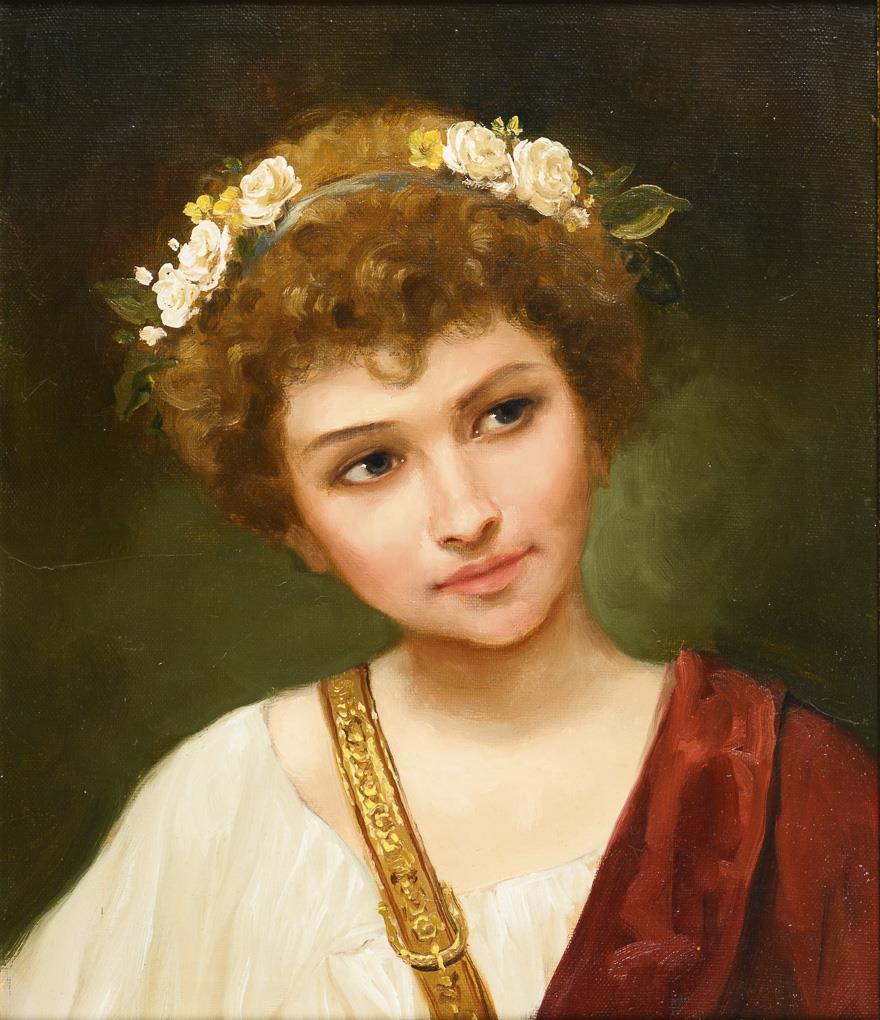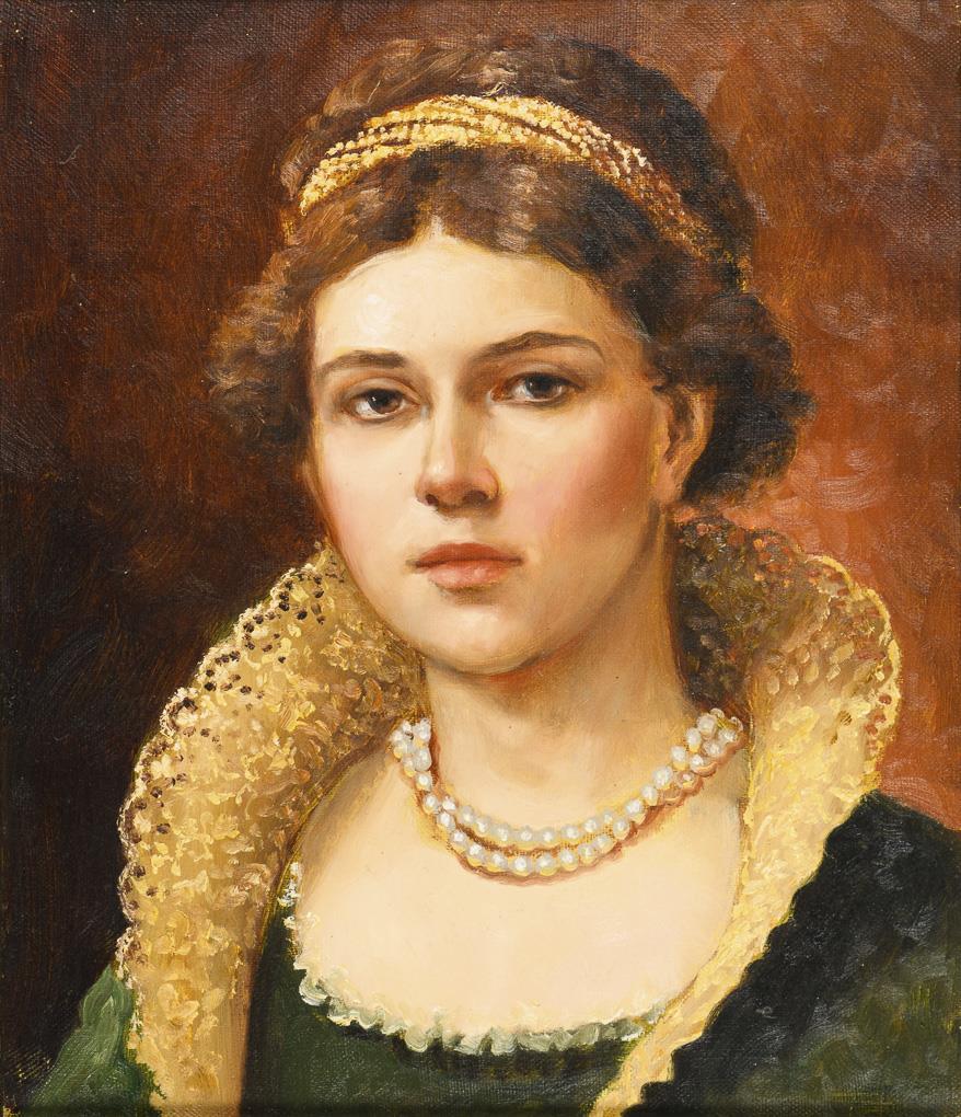 Portrait of a young woman with pearl necklace and golden hair ribbon and portrait of a young woman with a wreath of flowers in curly hair.
