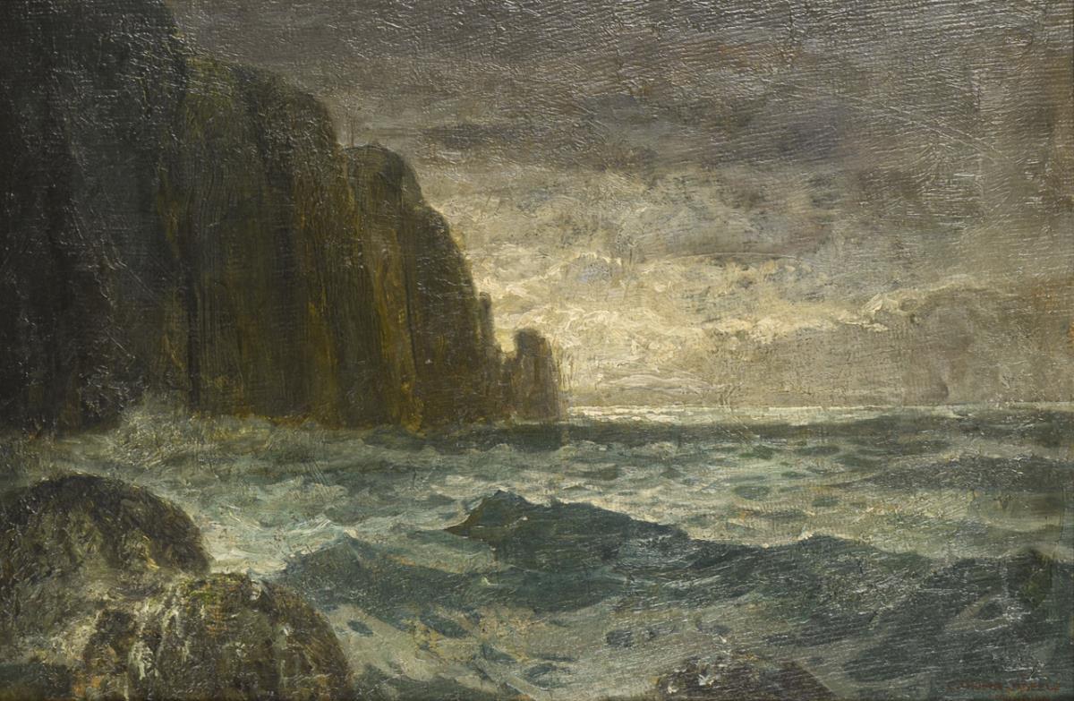 Cliff with surf under dark cloudy sky. In need of cleaning.
