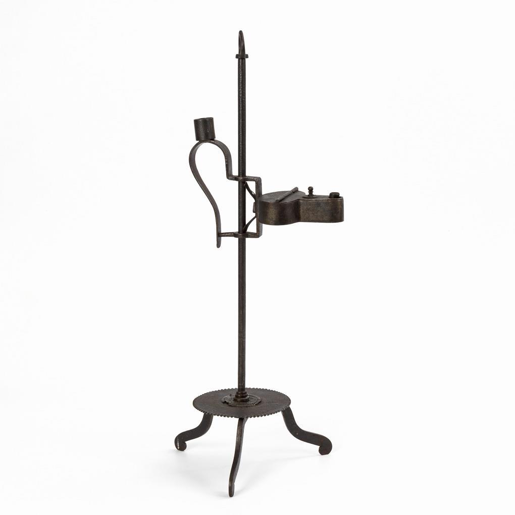Round base with wavy rim and 3 legs, ornamental disc under the sliding bar with stepped base and carrying ring on top, height adjustable beet oil lamp with long snout and hinged lid. On the handle mounted roller spout. Few flaws on the decorative disc.