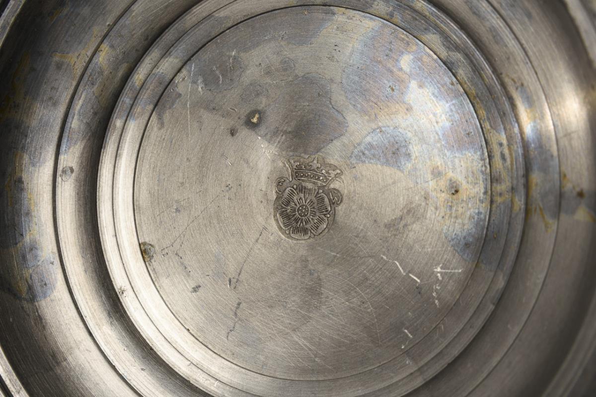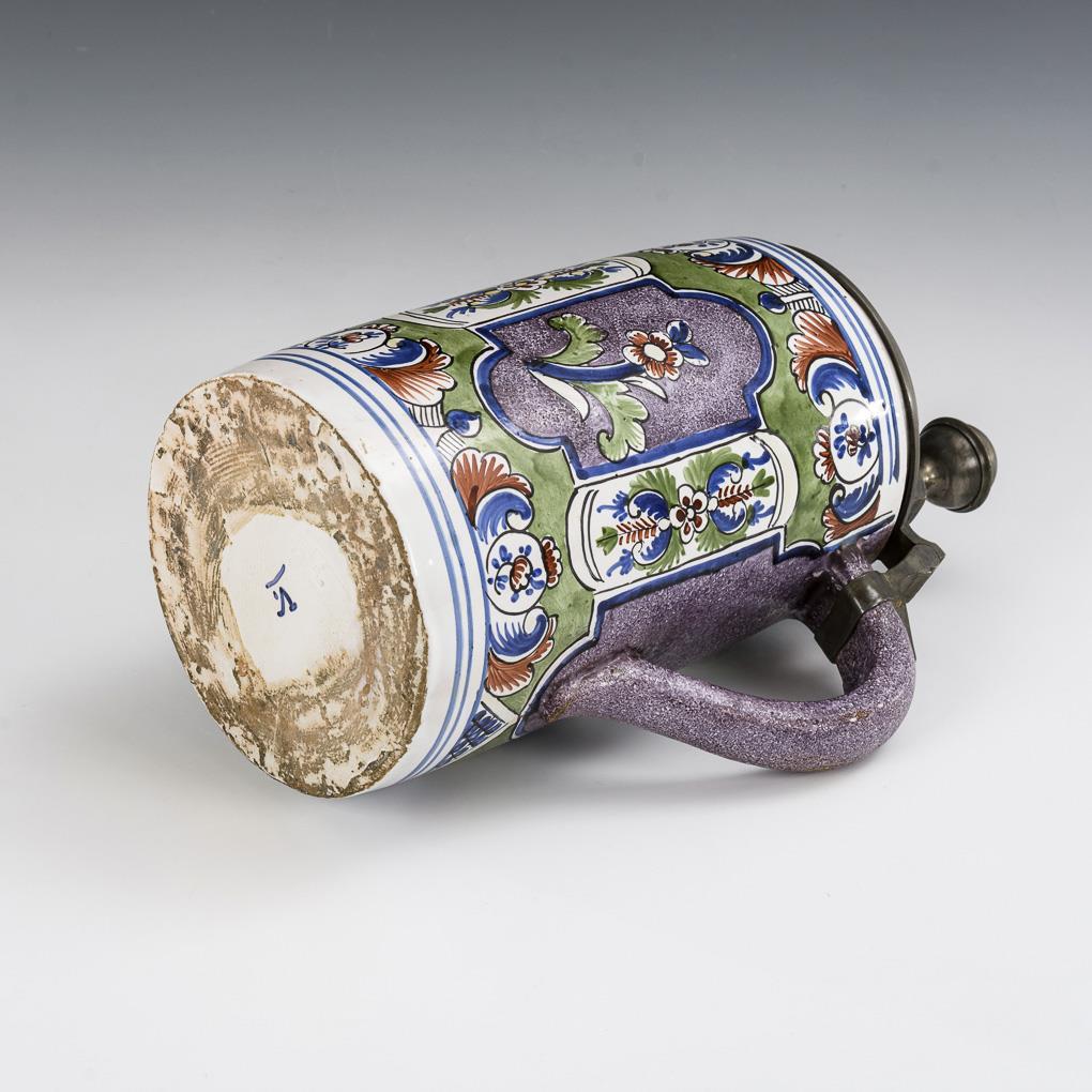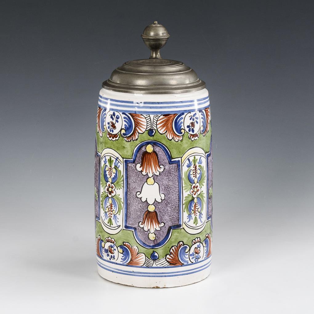 Cylindrical form with ribbon handle. Manganese casted baroque reserves and floral painting. Profiled pewter lid with ball pusher and relief plaque. Mouth rim slightly bumped, partial light glaze rubbing.