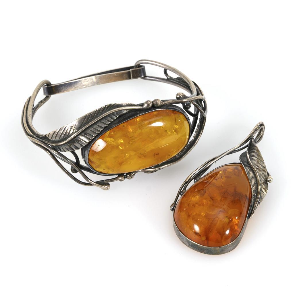 Bracelet and pendant with casket-set large cabochons between foliate decoration. Hanging hook. Rigid loop.