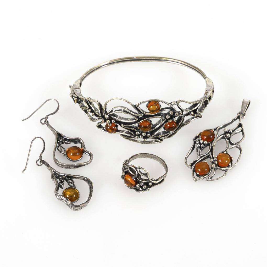 Silver 800/925 stamped, tested. Bangle Ø 6.4 cm. Pendant 5 x 2.5 cm. Ring size 59. earrings 3.5 x 1.7 cm. 19,8/6,4/3,7/6,2 g.