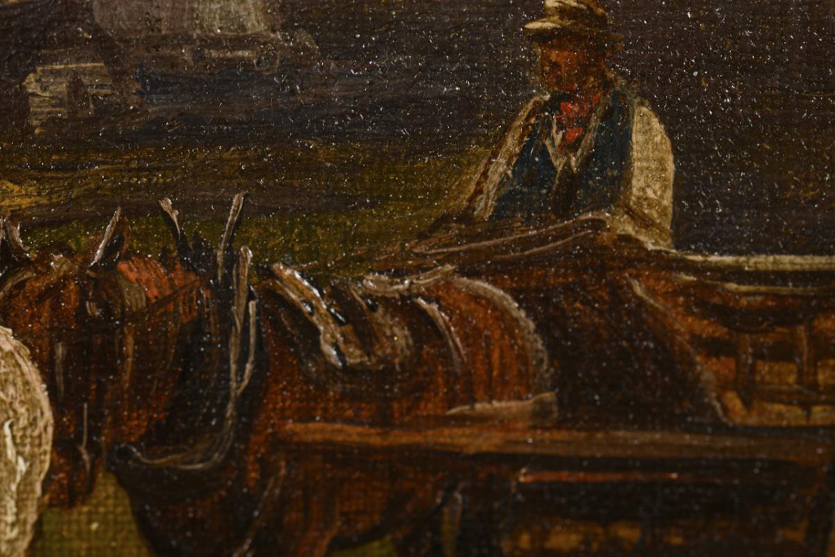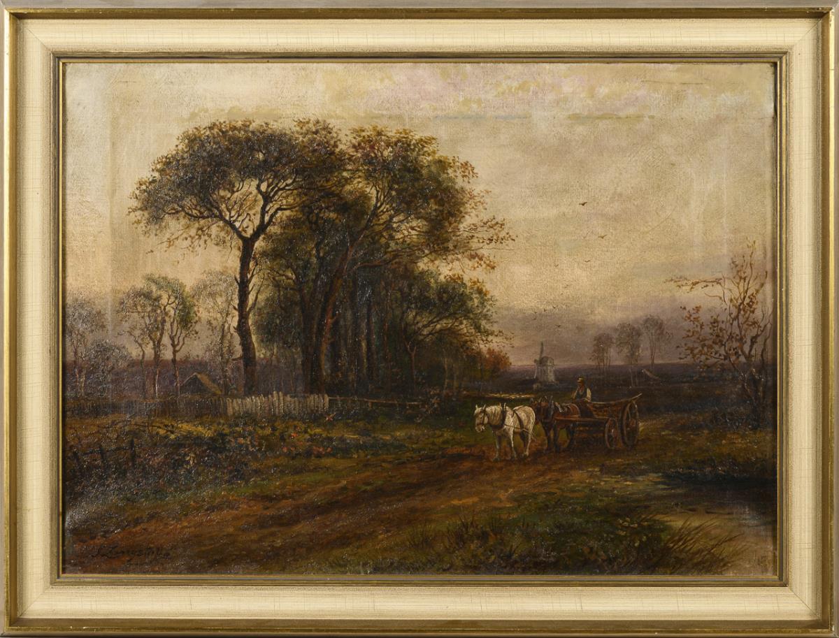 Horse-drawn carriage with farmer on a road in a wide landscape with mill. Slight signs of age.