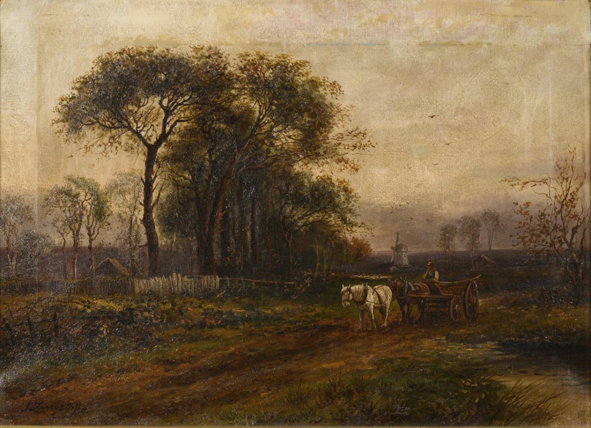 Horse-drawn carriage with farmer on a road in a wide landscape with mill. Slight signs of age.
