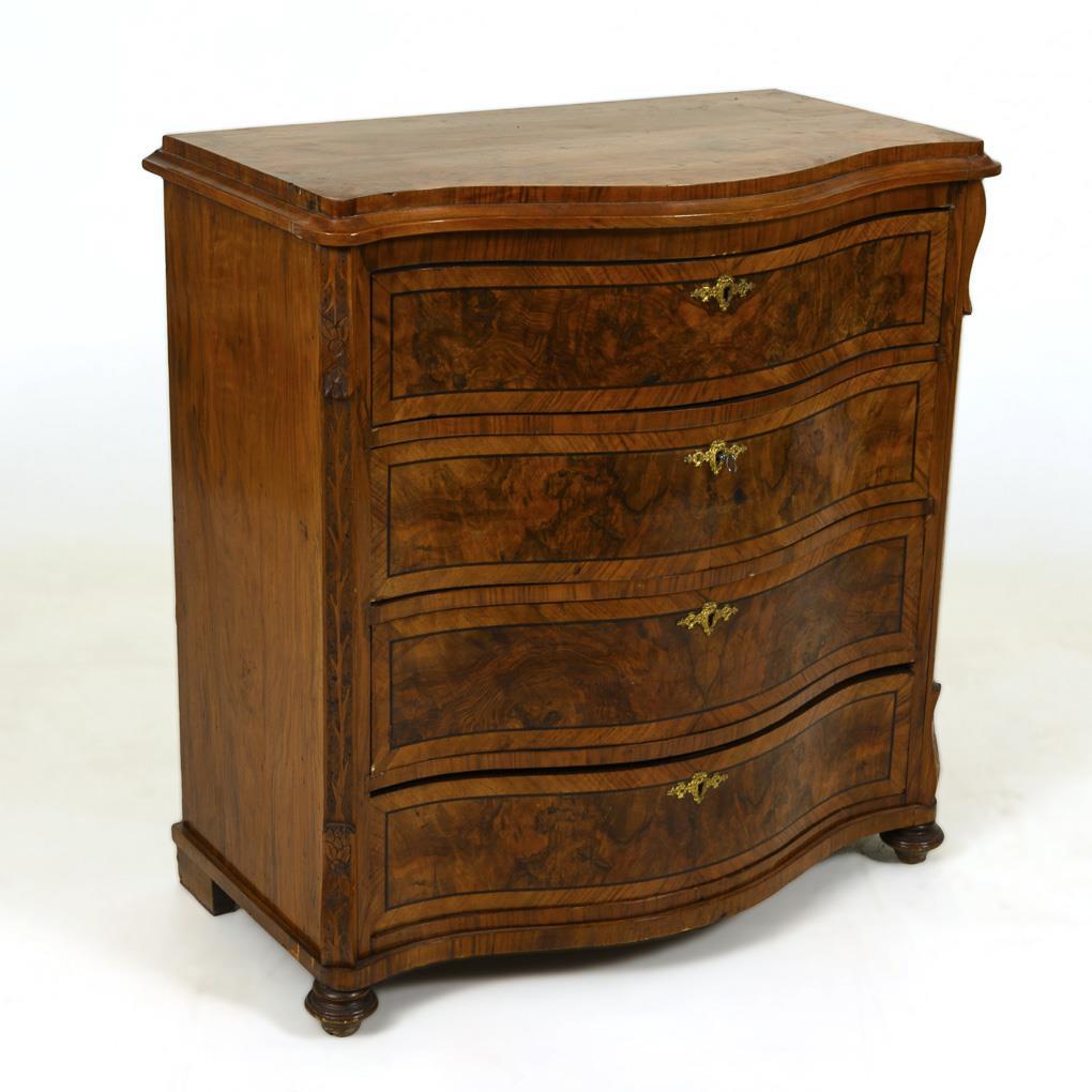 4-bay dresser in curved form, decorated with coffered, mirrored burl veneer, voluted side rails and bronze applications; top drawer with 3 lidded compartments. Old restored, signs of age / use, some restoration needed.