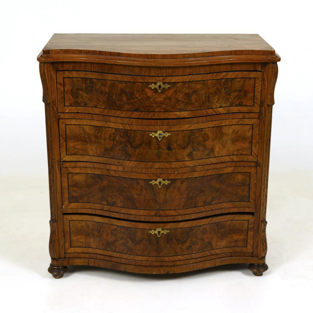 4-bay dresser in curved form, decorated with coffered, mirrored burl veneer, voluted side rails and bronze applications; top drawer with 3 lidded compartments. Old restored, signs of age / use, some restoration needed.