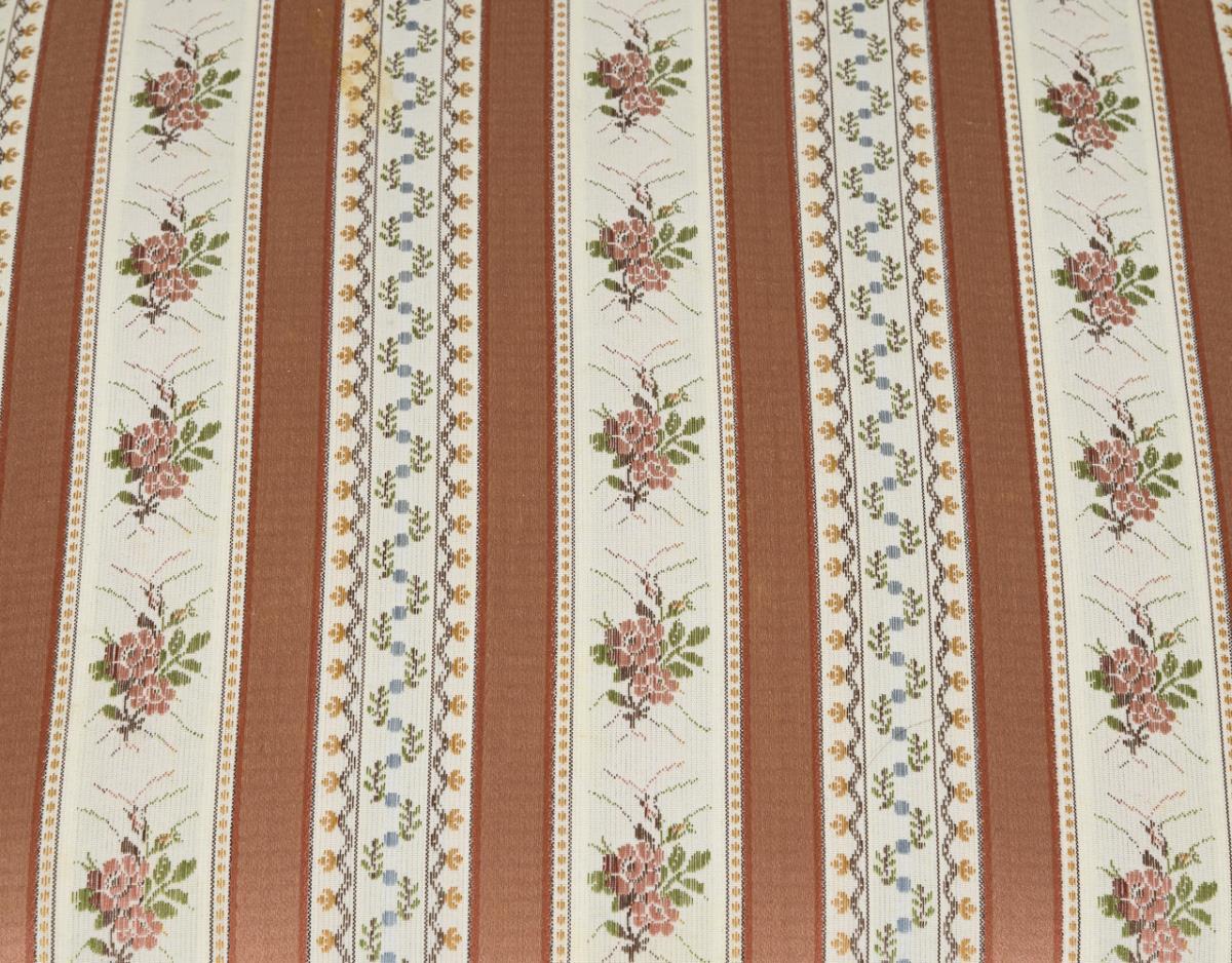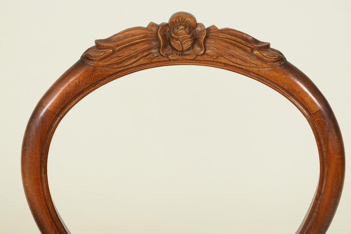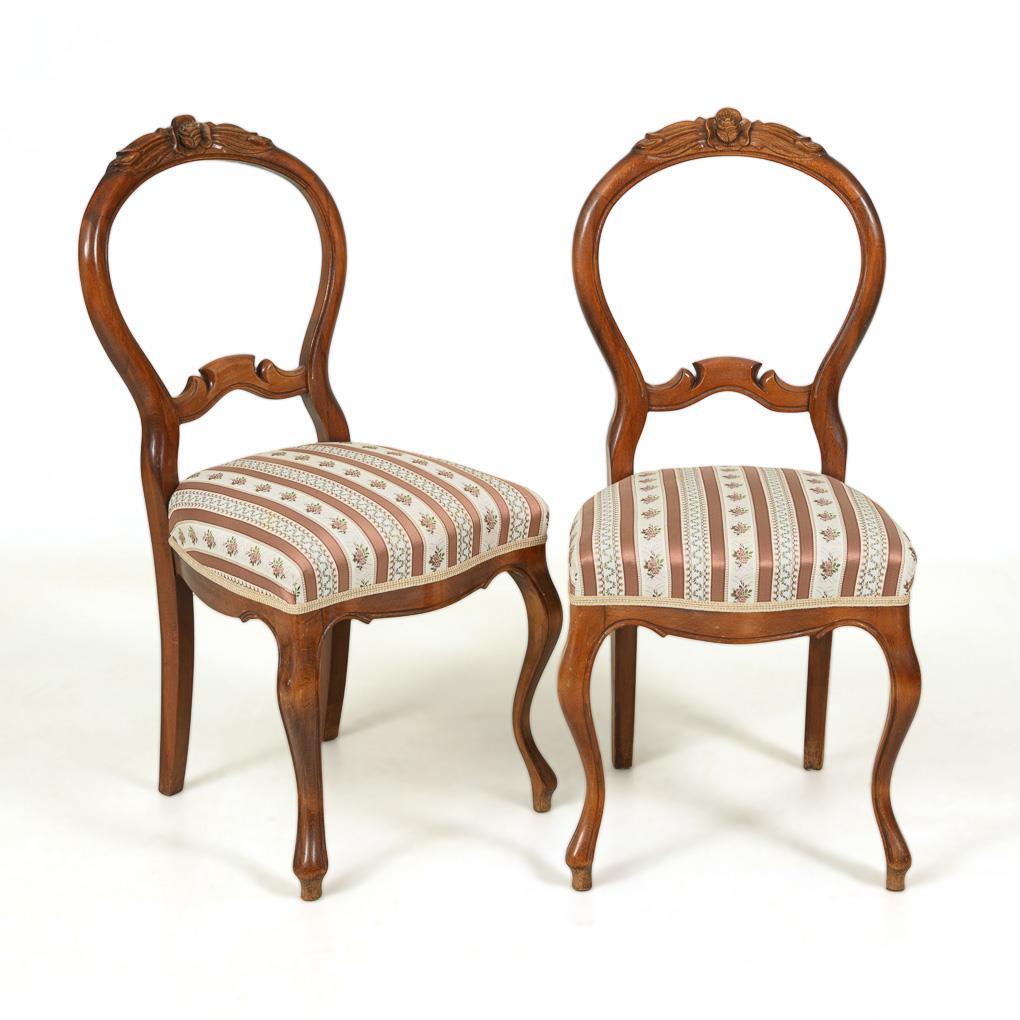 2 Louis Philippe style upholstered armchairs with front curved legs and balloon-like transparent backrest, decorated with floral carving and sprinkled central strut; red striped cover with floral pattern. Slight signs of age/use.