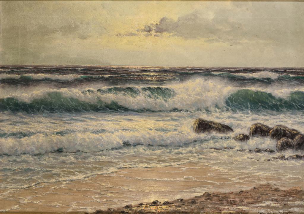 Hohe Brandung am Strand bei untergehender Sonne am Horizont. Altersspuren.