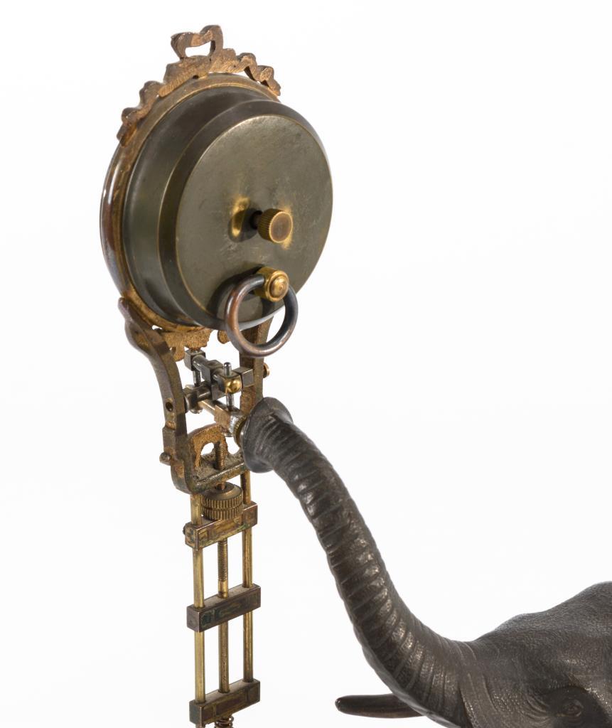 Metall, dunkel bronziert. Elefantenplastik auf ovalem Holzsockel, am Rüssel eine Montur zur Aufhängung der Uhr. Werk läuft.Lötspuren, leichte Gebrauchsspuren.