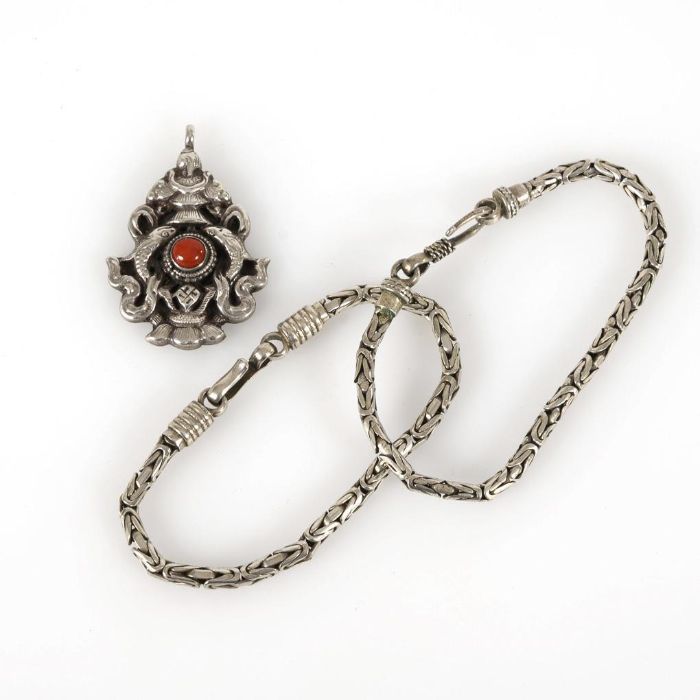 Relief pendant with coral cabochon and 2 king chain bracelets with hooks.