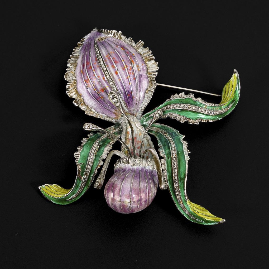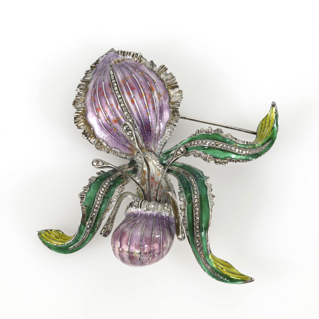 Sculptured lady's slipper flower with colored translucent enamel and partially embedded marcasites.