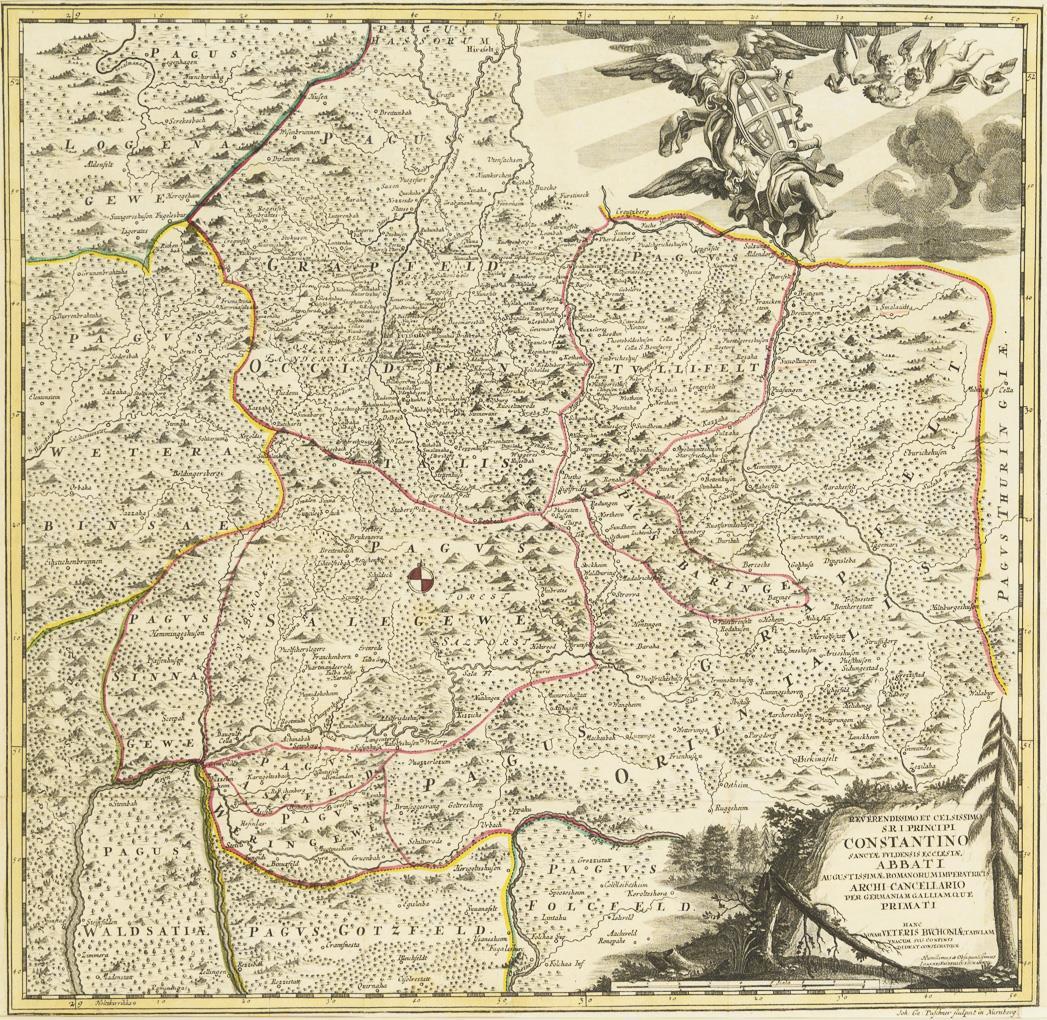 Historical detailed map of the Princely Abbey of Fulda, with title cartouche with dedication to Abbot Constantine of Fulda "Reverendissimo Et Celsissimo S. R. I. Principi Constantino Sanctae Fuldensis Ecclesiae Abbati [...]" and large figural cartouche with coat of arms, after a map by Johann Friedrich Schannat (1683 -1739). Buck creases, some grip.