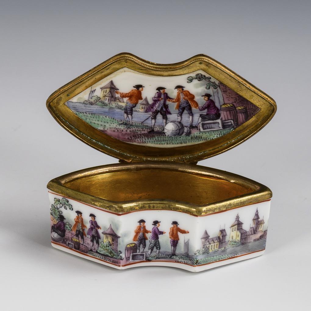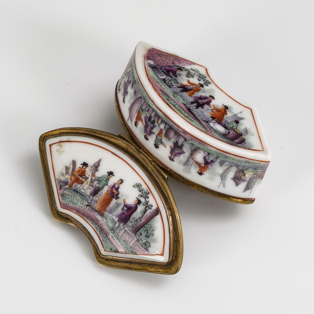 Fan-shaped, small tabatiere with brass-mounted hinged lid. All sides and lid finely painted port scenes with merchants, fishermen and cargoes of goods, gilded.