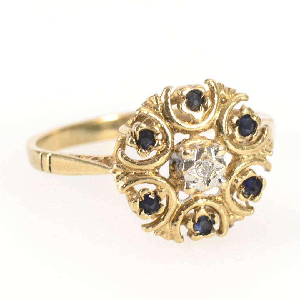 Small inset diamond surrounded by 6 small sapphires between narrow rail.