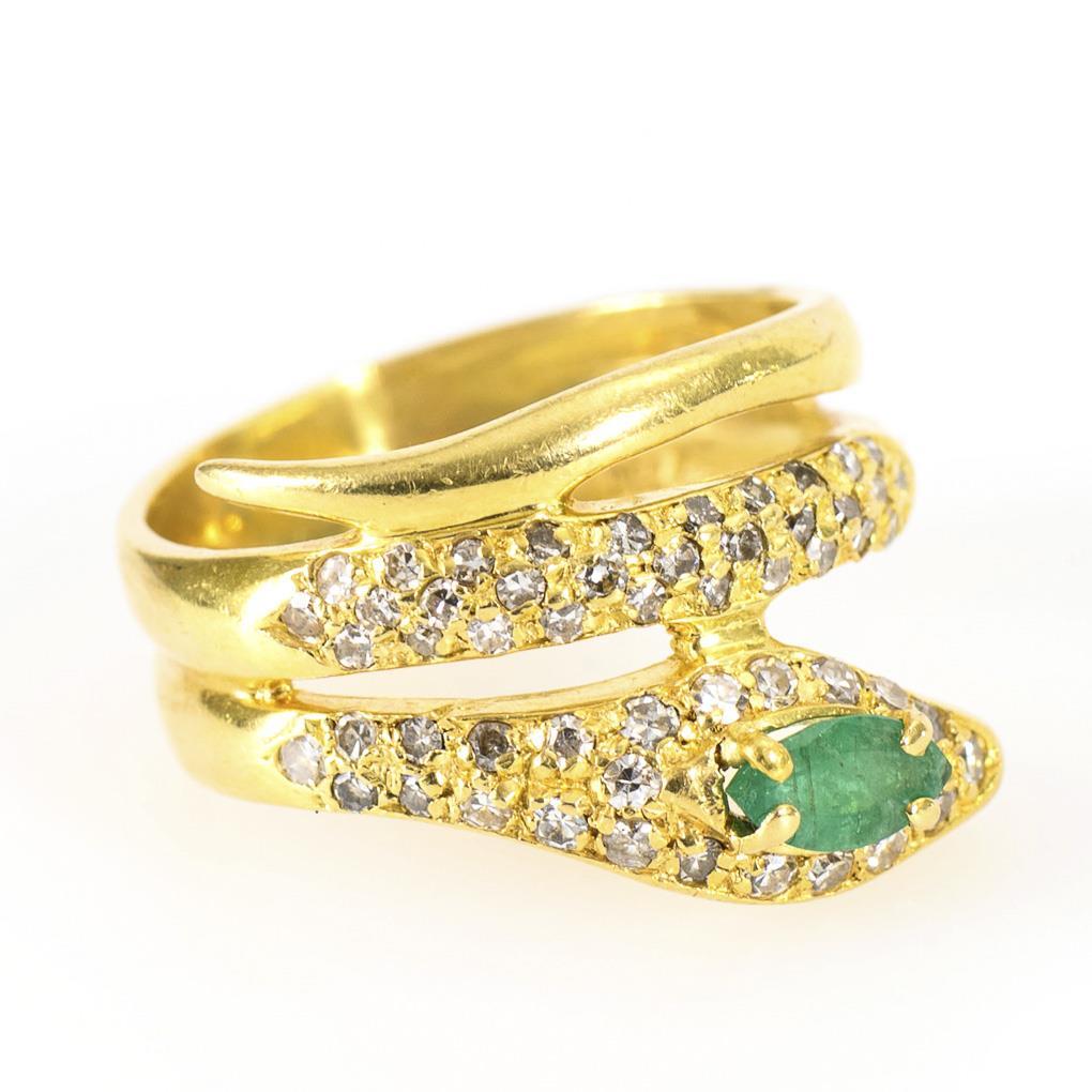 Snake ring with emerald and diamonds.