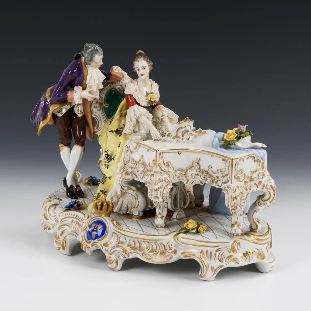Rokokogruppe mit einer am Flügel sitzenden Dame sowie einem sich zu ihr beugenden Kavalier. Spitze minimal bestoßen.