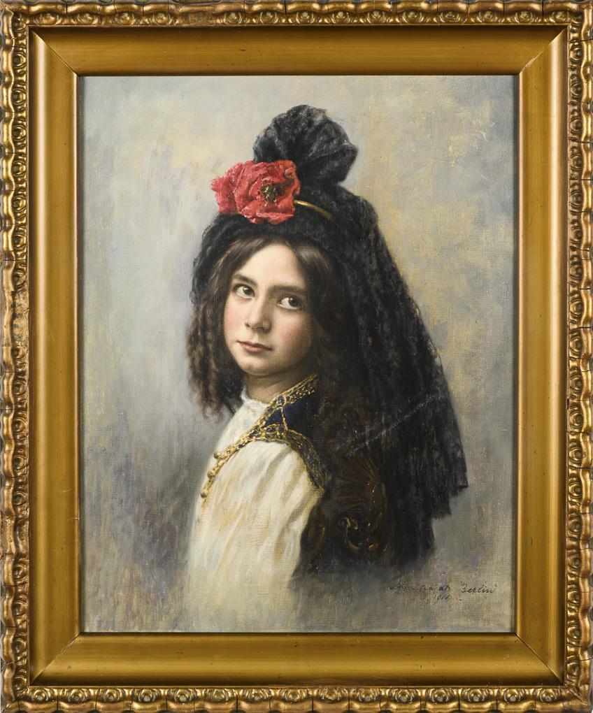 Portrait of a girl with curly hair in traditional costume against a neutral background | Supplement 18.6.2023: The picture was never part of the collection of the Grand Ducal Museum in Weimar. Little retouched.
