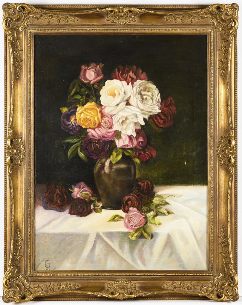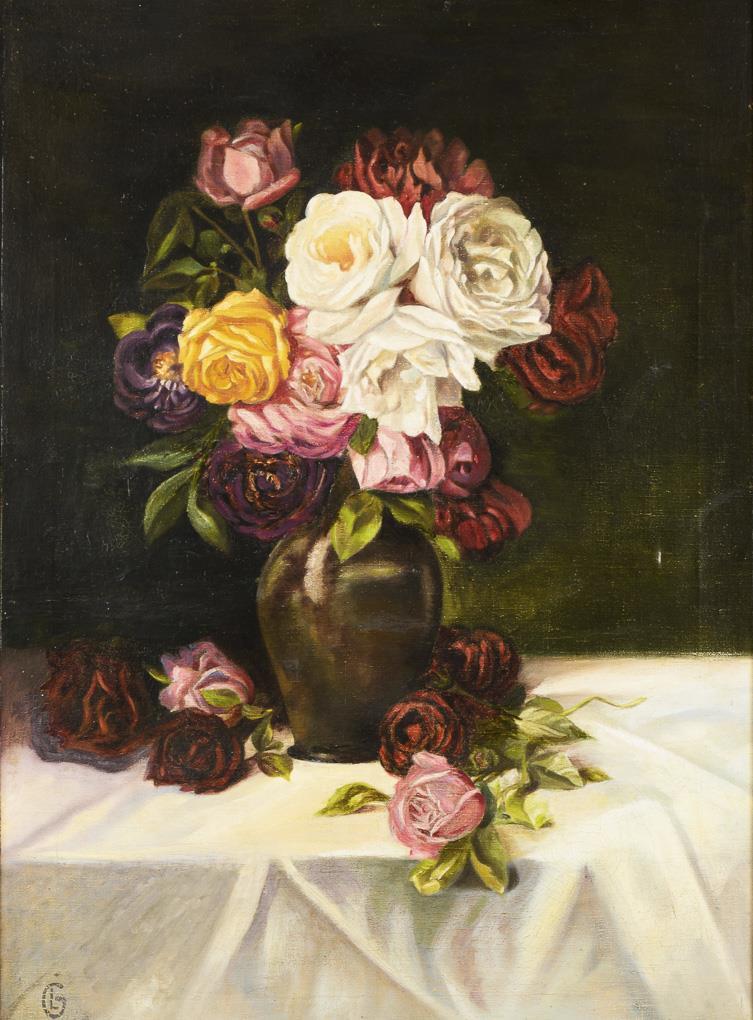 Large bouquet of roses with different colored flowers in a vase on a white tablecloth and against a dark background. Little retouched.