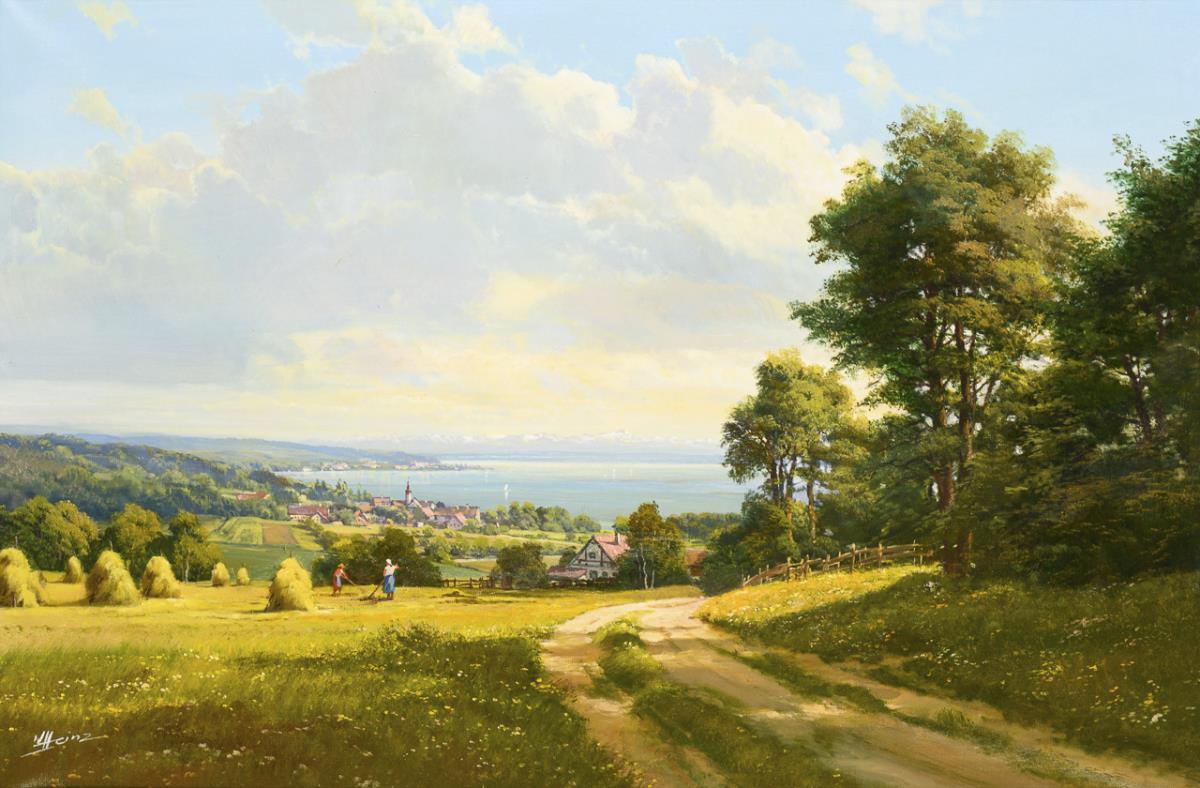 Farmers at the hay harvest above the village in the sunshine with a view over the lake to the Säntis in the background.