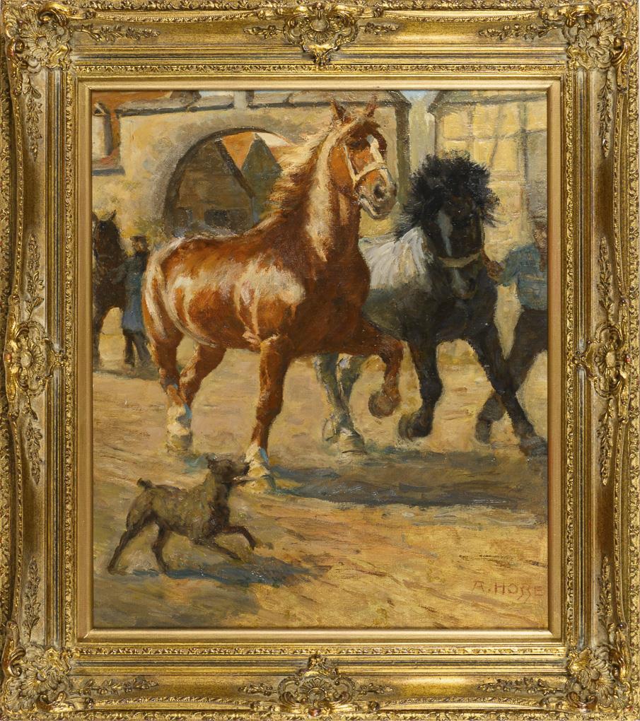 Startled at a small dog reacting horses in bright sunlight. Minimal signs of age.