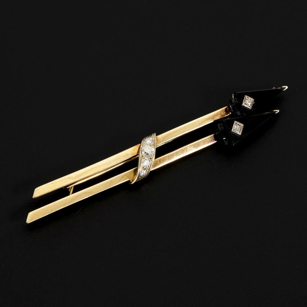 Double arrow-shaped pin with 2 onyx segments, 2 small diamonds and 4 inset old-cut diamonds. Ball hook.