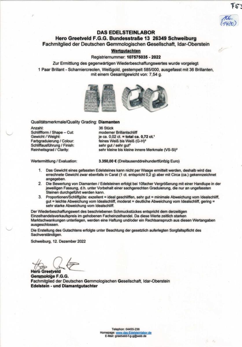 White gold 585 stamped. Ø 1.2 cm. Width 0.8 cm. Diamonds total approx. 0.72 ct/fine white/white/vs-si. 7,5 g.