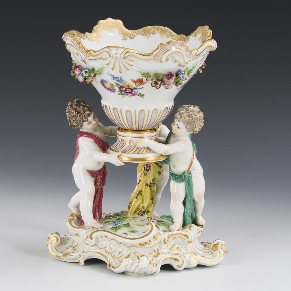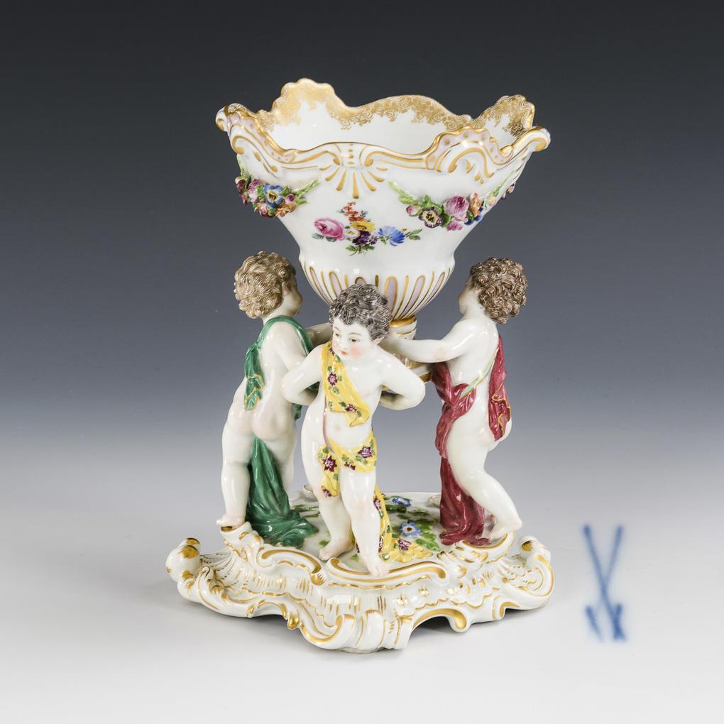 Three putti. 2 petals bumped, standing on a rocaille base, carrying a large bowl.