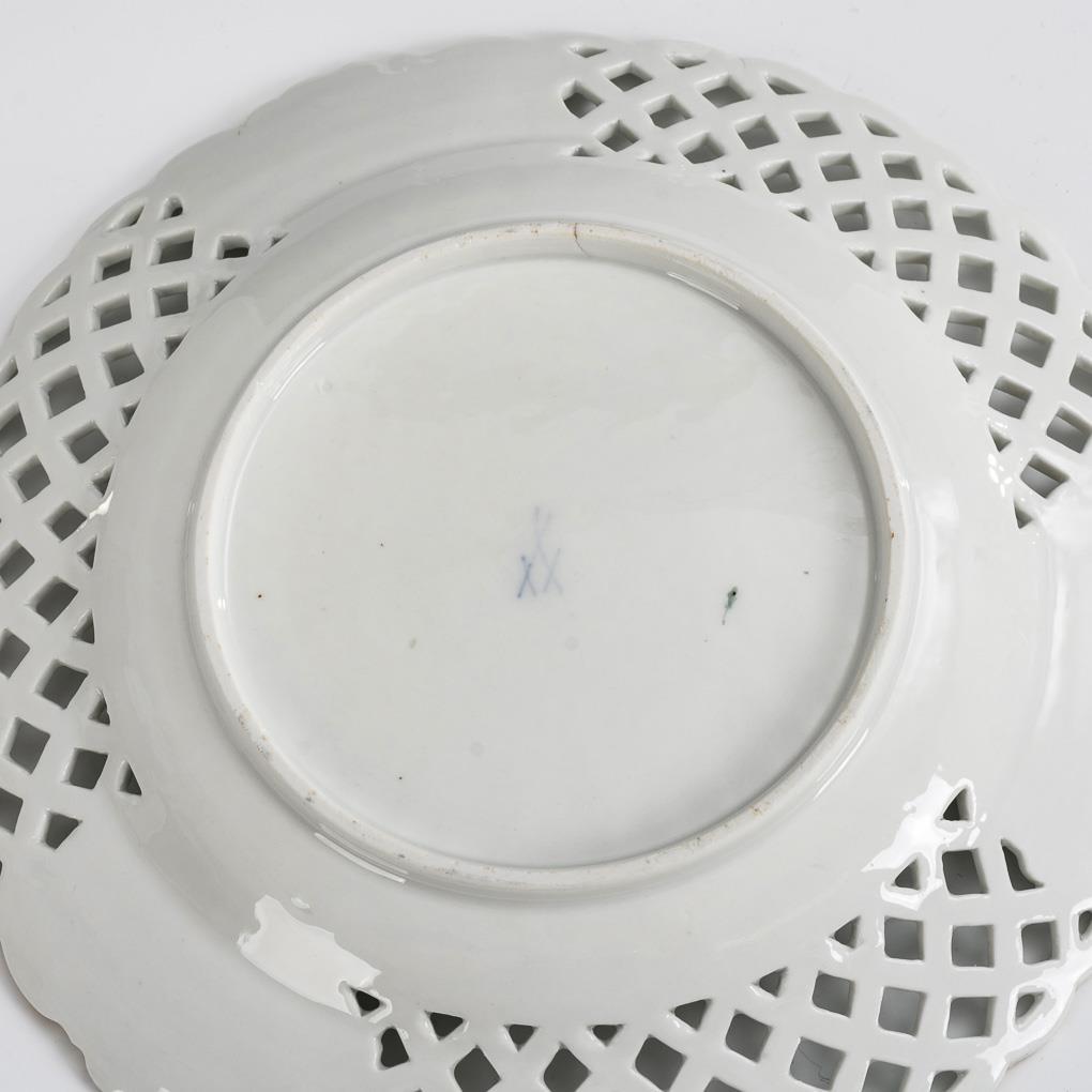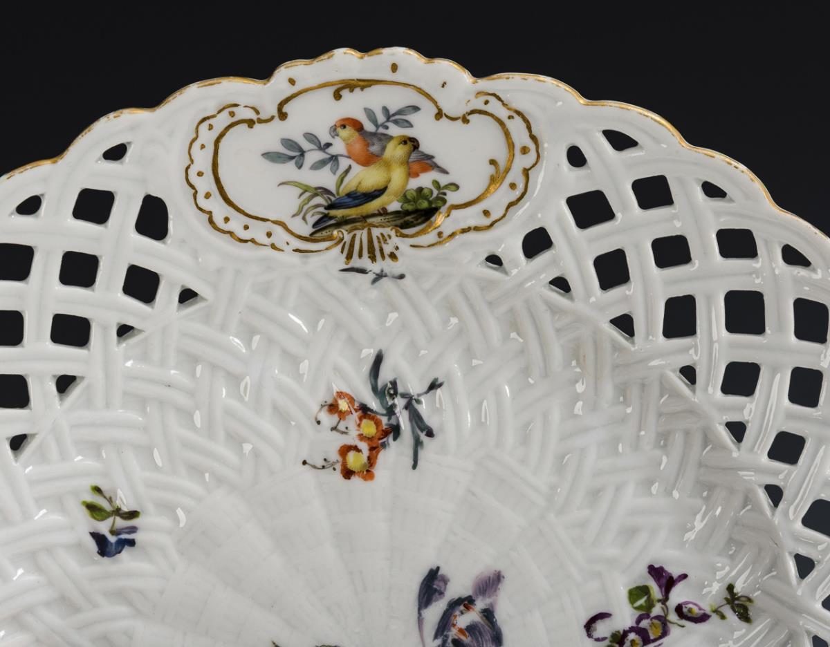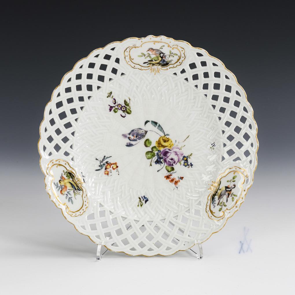 Dessert plate with floral painting in the mirror and bird painting in three rocaille cartouches. Gold rubbed, traces of use in the mirror.