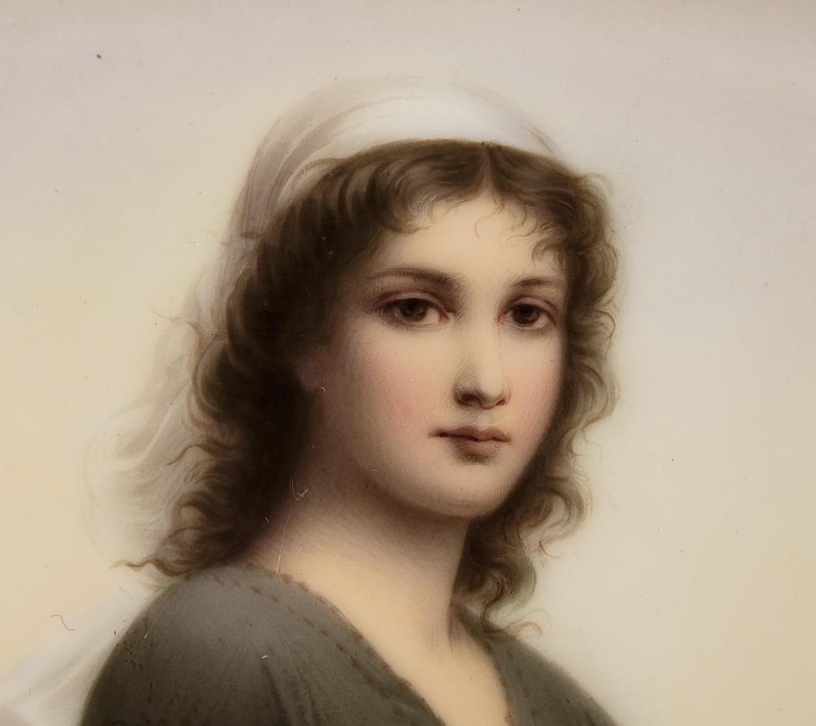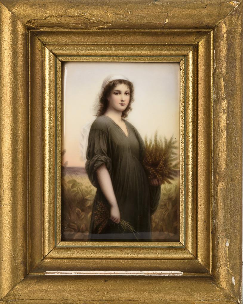 Rectangular plate depicting a young woman picking ears of corn, after a painting by Charles Zacharie Landelle (1821-1908). Frame retouched.