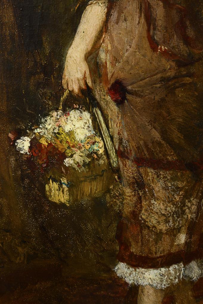 Young woman in dress and with flower basket in southern interior. Slight signs of age.