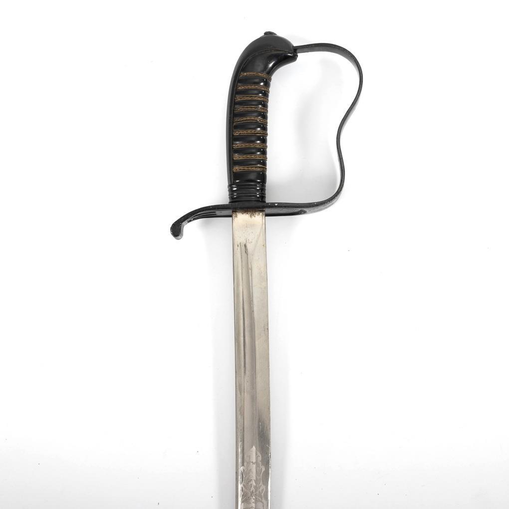 Slightly curved, single-edged blade with etched design "In Treue fest". Black lacquered metal scabbard.