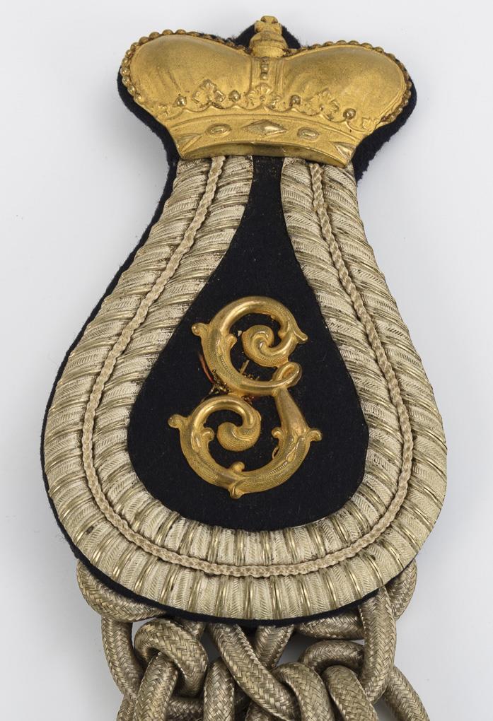 Shoulder with gold-colored "G" and princely crown and silver-colored "braid" (crown and braid solid casting). Cord of silver-colored round braid partly braided and with 2 crowned metal finials, 1 of which formed as a pipe. Few signs of age/use.