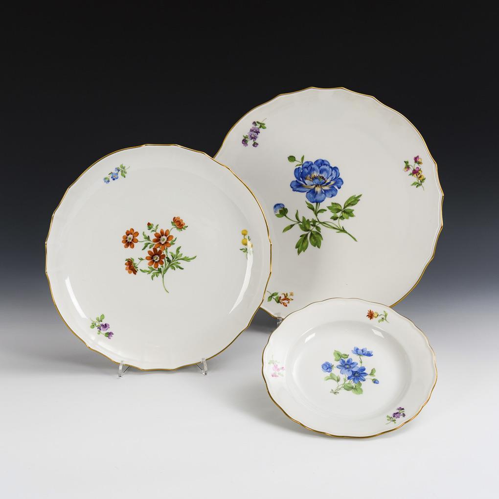 Polychrome floral painting, gold staffage. Cake plate (Ø 32,5 cm), credenza plate (Ø 28,5 cm), breakfast plate (Ø 20,5 cm).