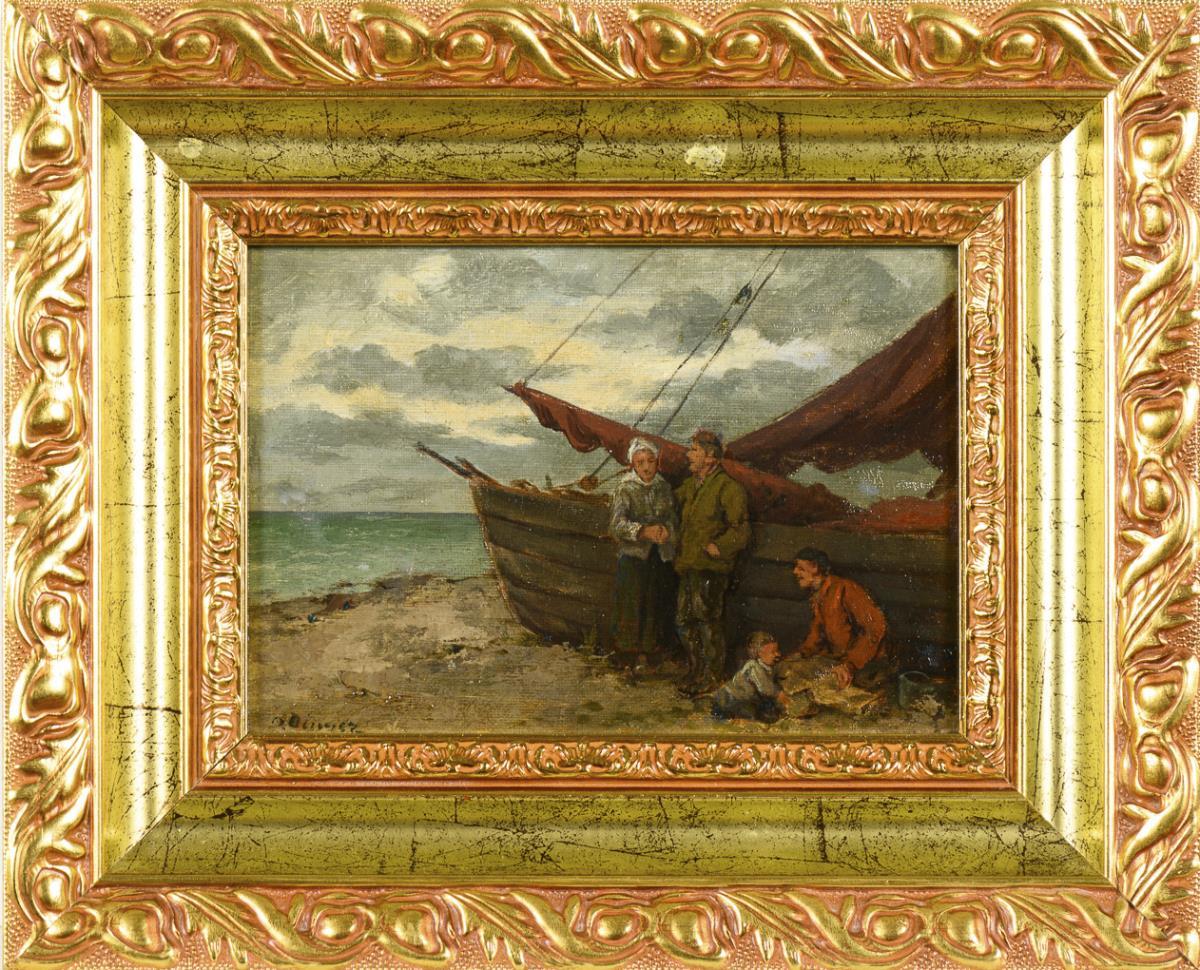 Fishermen's family at the boat on the beach with a view of the sea under cloudy sky. Slight signs of age.
