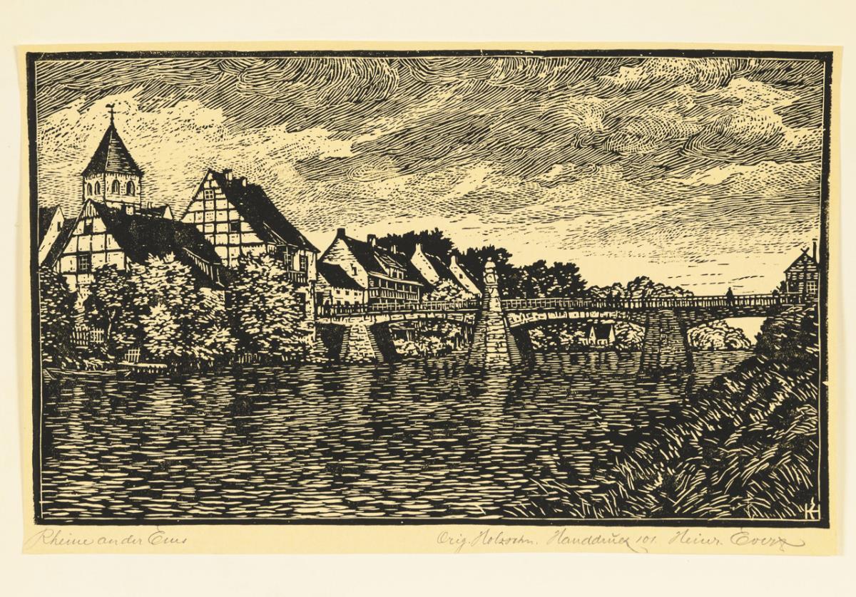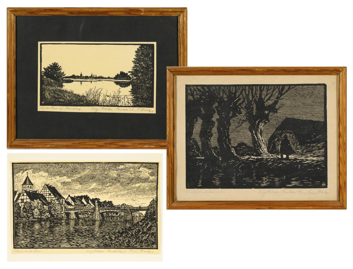 "Rheine an der Ems", copy: 101, printing block: 17.8 x 29 cm, sheet: 19 x 29.6 cm, unframed, sheet light browned | "An der Ems bei Warendorf", printing block: 12.5 x 22 cm, framed & behind glass: 28 x 35 cm | "De Spökenkieker", printing block: 20.3 x 27.3 cm, framed & behind glass: 28 x 35 cm, on grayish paper.