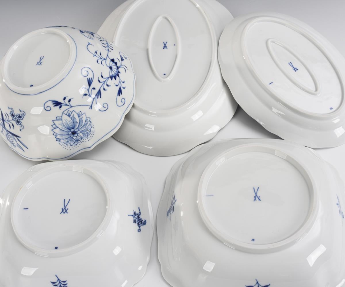 Underglaze blue painting. 2 square bowls (18,5 x 18,5 cm and 22,5 x 22,5 cm), 1 round bowl (Ø 19 cm) and 2 oval plates (L 22,5 and 30 cm).