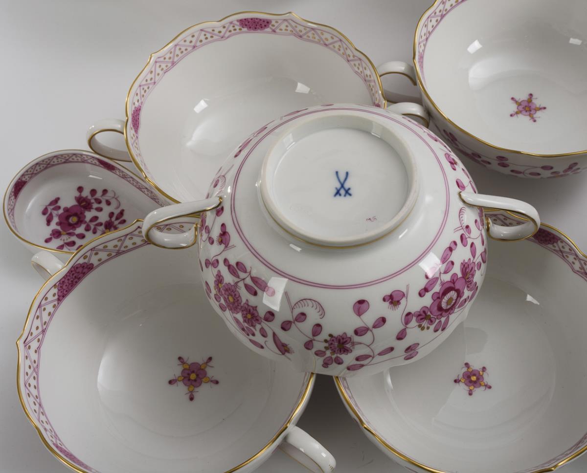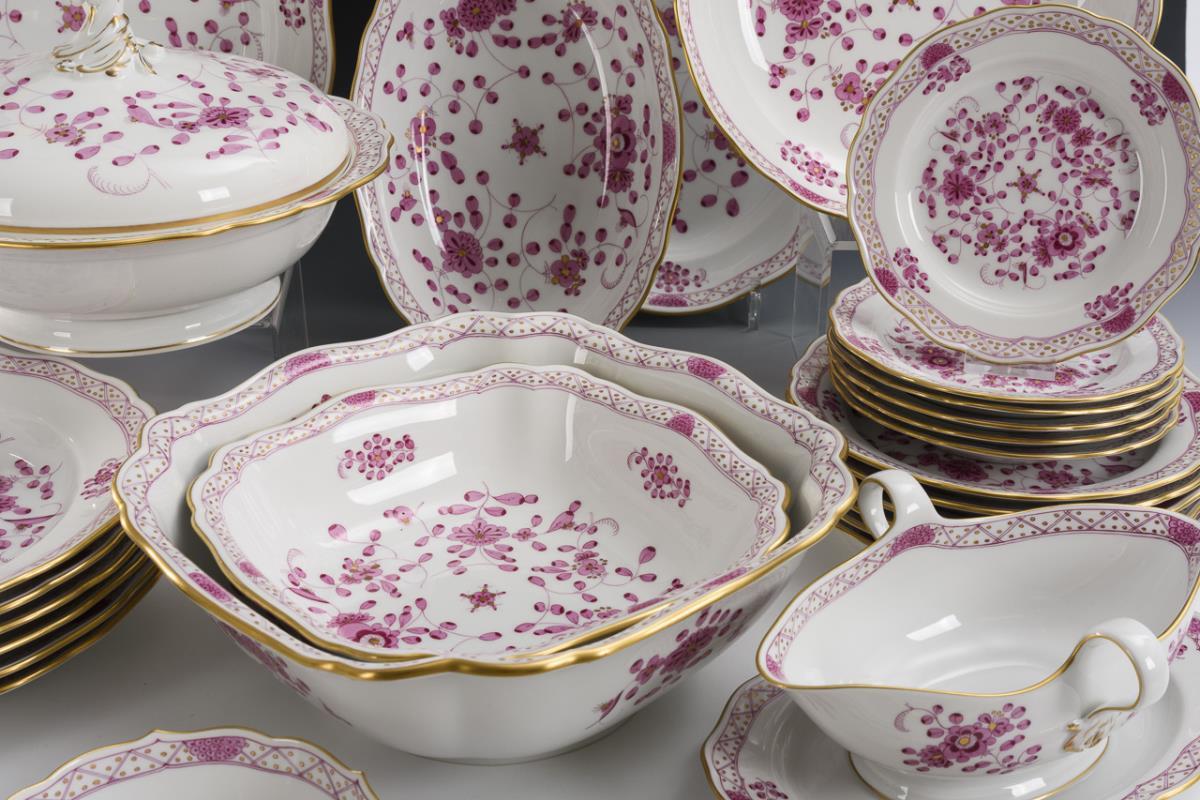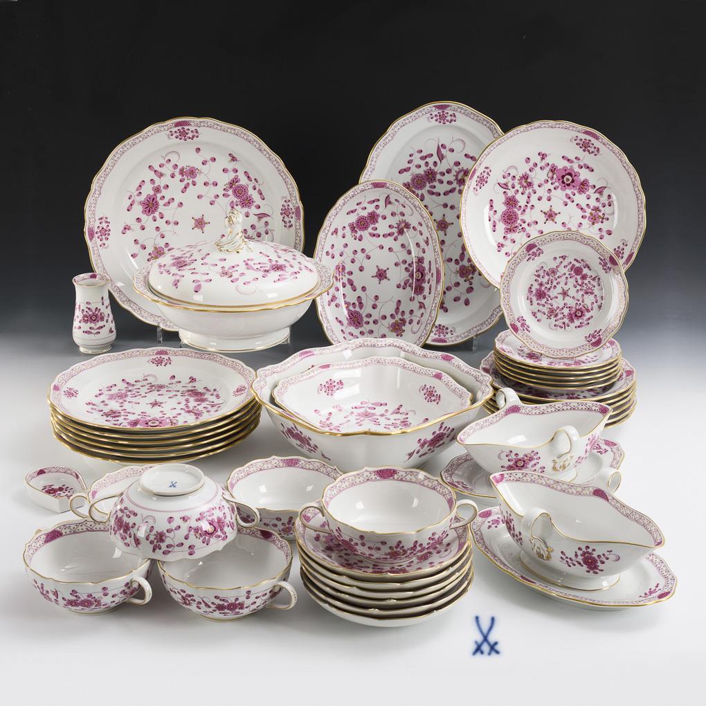 41 parts. Shape "New Cutout". 6 dinner plates, 6 soup cups with 6 saucers, 6 salad plates, 6 dessert plates, 2 square bowls (22 x 22,5 and 26,5 x 27 cm), 2 sauce boats, 1 oval plate (L 36 cm), 1 vegetable plate (Ø 32 cm), 1 round bowl (Ø 26 cm), 1 oval bowl (L 27 cm), 1 lidded bowl (Ø 27 cm), 1 ashtray and 1 vase.