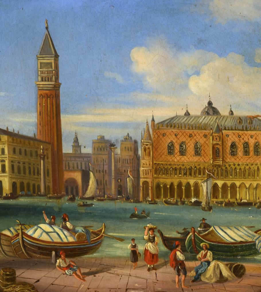 Many people near the canal looking across to the entrance of St. Mark's Square in the bright sunshine. Traces of age.