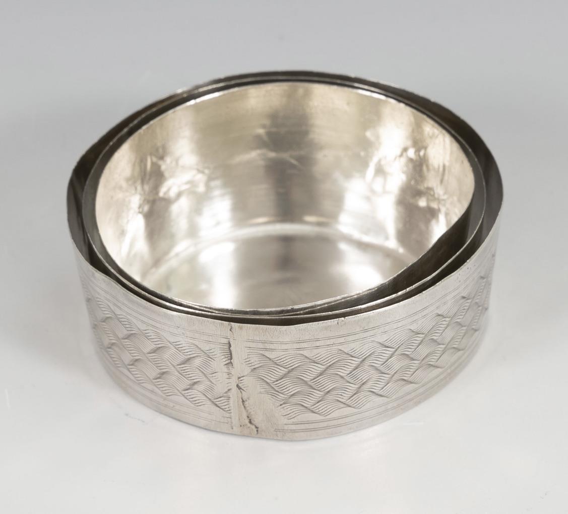 Ottoman clamshell cup with Arabic hallmarks (pre-1923), consisting of 3 conical silver rings, h 6.5 cm. Heavy fist cup (Birmingham, 1898) with slightly indented smooth wall, h 8 cm. Signs of use, clamshell cup with dents.