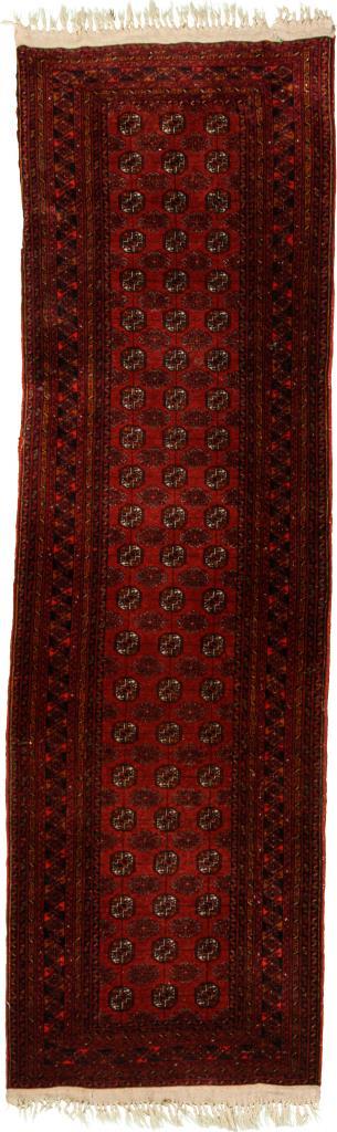 Wolle, handgeknüpft. Monochromdekor in Kirschrot, Orange, Braun, Schwarz und Weiß.86 x 300 cm.